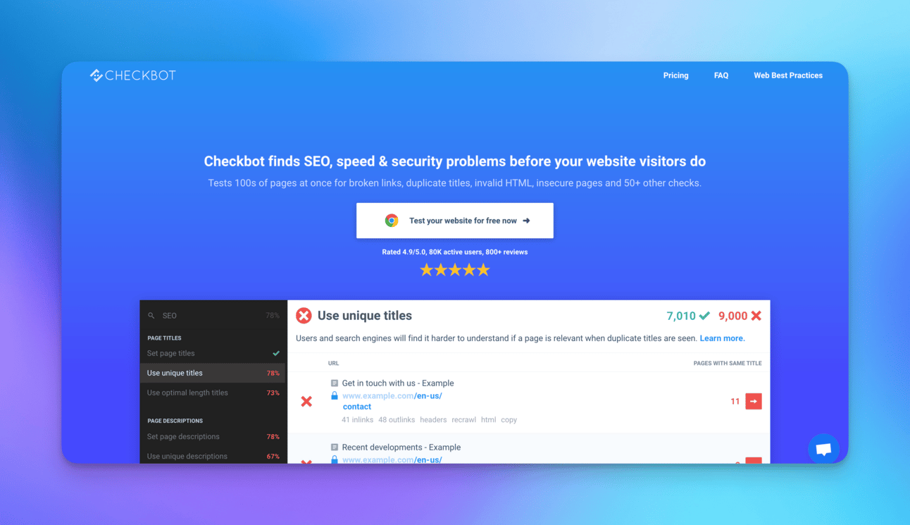 Your copy is ready, the graphics uploaded. Your website is about to go online. But… have you checked if the SEO’s alright? Try Checkbot and crawl hundreds of pages in a few seconds.