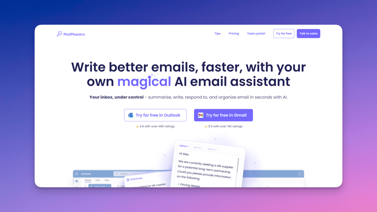 An AI email assistant that helps you write better emails, faster. It keeps your inbox under control, organizing replies, providing instant email summaries, automating repetitive tasks and personalizing messages.
