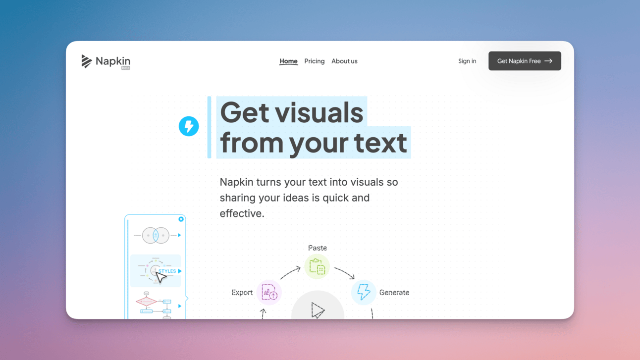 Turn your text into visuals. Just type, copy-paste or generate your text and Napkin will instantly transform it into insightful visuals.