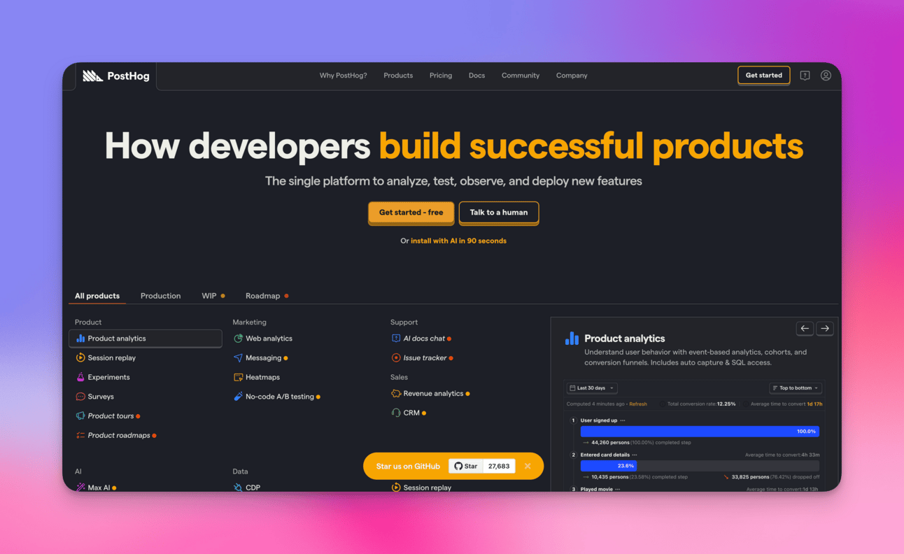 PostHog is the only all-in-one platform for product analytics, feature flags, session replays, experiments, and surveys that's built for developers.