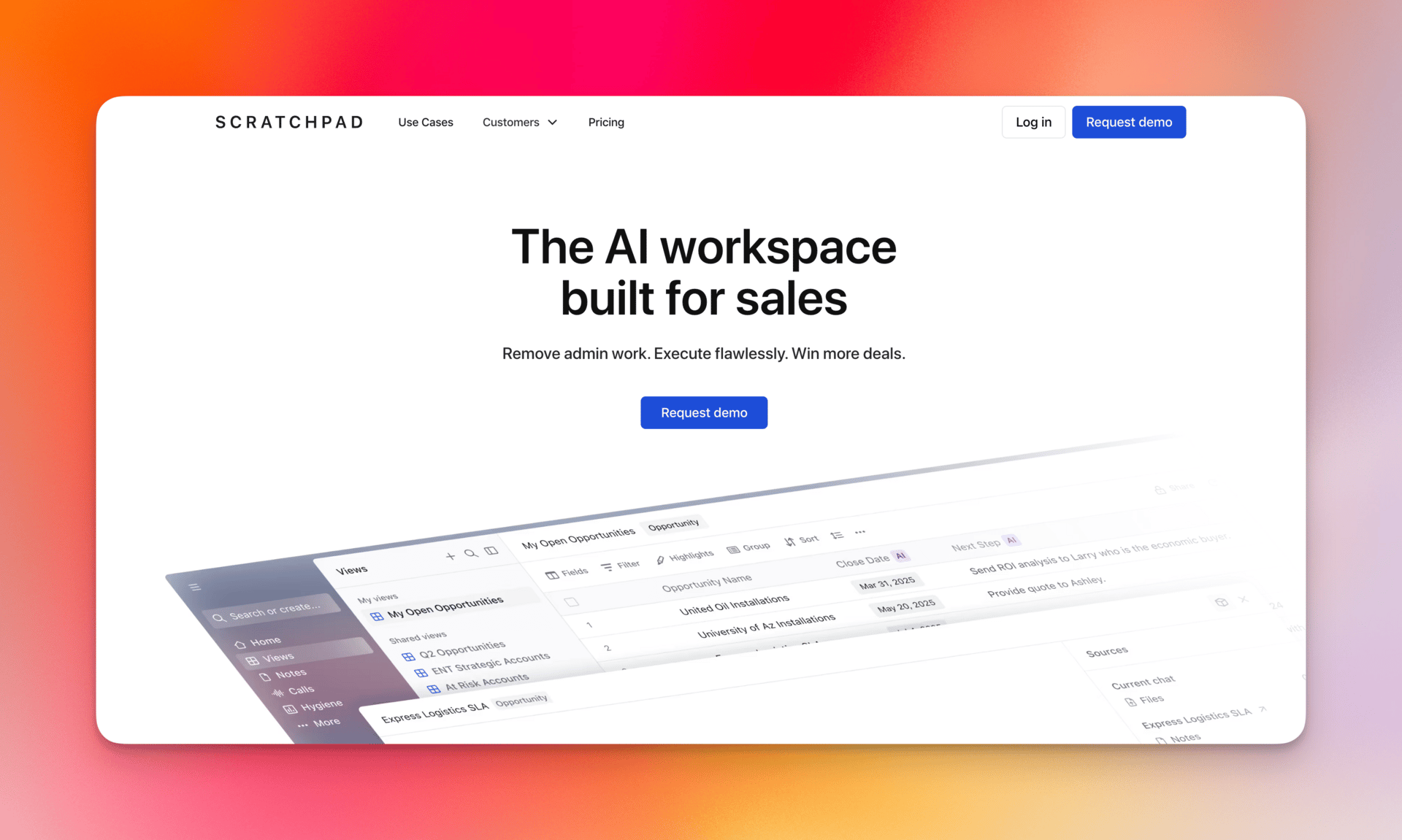 An AI‐powered workspace designed for sales teams, with a strong focus on eliminating administrative friction so reps can spend more time closing deals.