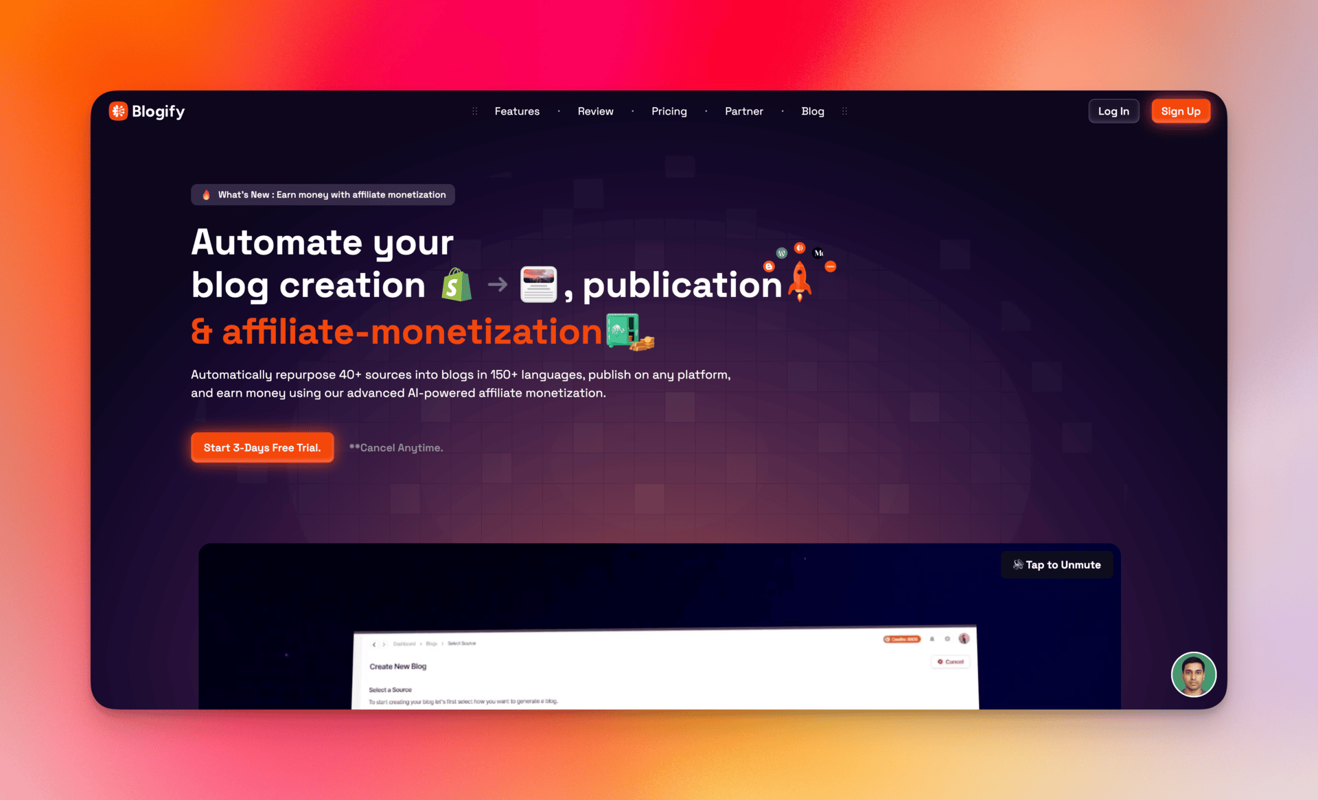 Automatically repurpose 40+ sources into blogs, publish on any platform, and earn money using our advanced AI-powered affiliate monetization.